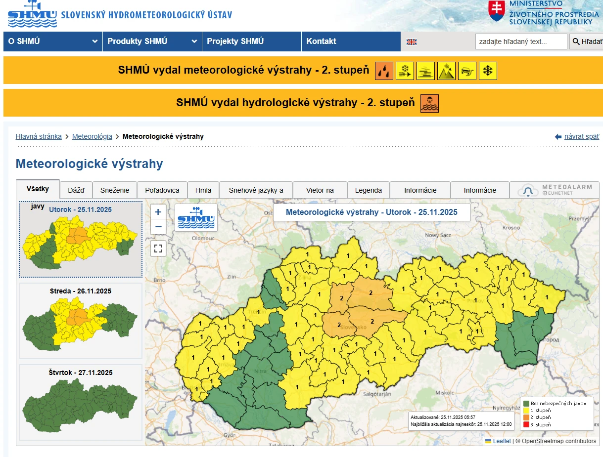 „Vzhľadom na existujúce snehové zásoby v povodiach, oteplenie a očakávaný dážď je predpoklad vzostupu vodných hladín na tokoch, s možnosťou dosiahnutia a prekročenia vodných stavov zodpovedajúcich stupňom PA," varujú meteorológovia s tým, že výstraha platí od 25.11.2025 17:00 až do 27.11.2025 10:00.