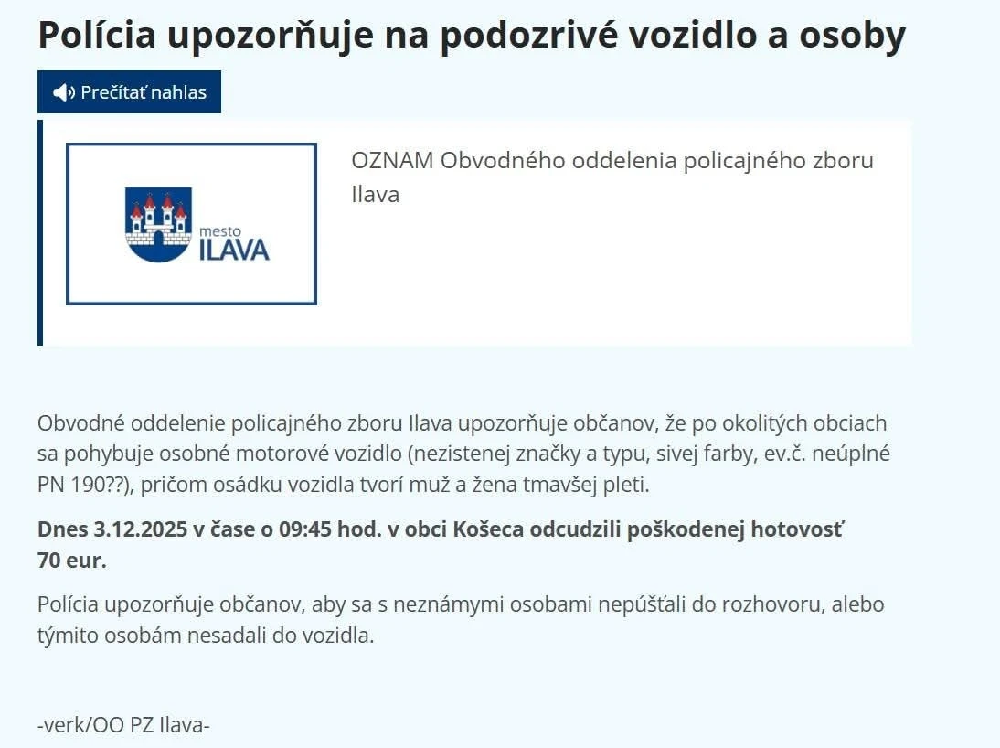 V stredu 3. decembra padla seniorka z obce Košeca za obeť podvodníkom, ktorí zneužili jej dôverčivosť. Žena stála na autobusovej zastávke v Ilave, keď ju oslovila dvojica vo vozidle značky Volkswagen s údajnou ponukou odvozu na miesto určenia.