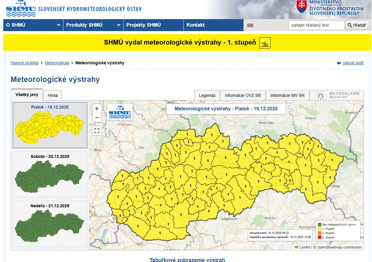 Slovenský hydrometeorologický ústav upozorňuje na hustú hmlu, ktorá komplikuje dopravu vo všetkých okresoch Trenčianskeho kraja. Výstraha 1. stupňa platí na piatok 19. decembra do 12:00.