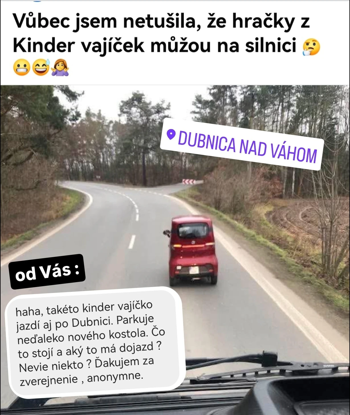 „Áno, chodí po Dubnici, je zaparkované Pod Hájom. Neviem, komu patrí, ale vždy si ho ideme pozrieť s mojím synom. Jemu sa to autíčko veľmi páči, je také maličké, že by sa aj on s ním zahral. Hlavne, že sa dostane človek kam potrebuje a nezaberá veľa miesta,“ napísala Majka.