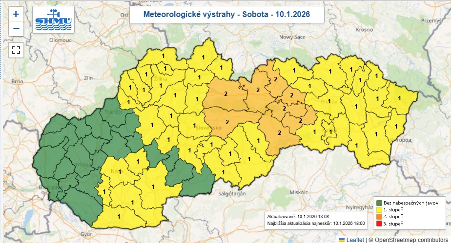 V sobotu 10. januára od 14:00 do 21:00 hod. platí výstraha prvého stupňa pred snehovými jazykmi a závejmi v okresoch Púchov a Považská Bystrica. Ich tvorba môže predstavovať potenciálne nebezpečenstvo najmä pre dopravné aktivity, keďže vietor v kombinácii so snehom môže znížiť viditeľnosť a spôsobiť zhoršené jazdné podmienky. Hoci ide o jav, ktorý je v tomto období bežný, môže viesť k menším škodám či komplikáciám na cestách.
