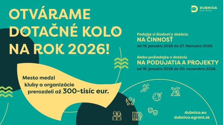 Mesto Dubnica nad Váhom spúšťa dotačné kolo na rok 2026, v rámci ktorého medzi miestne kluby, organizácie a združenia rozdelí 300-tisíc eur. O podporu môžu žiadať žiadatelia na svoju činnosť, projekty alebo podujatia. Žiadosti je možné podávať prostredníctvom elektronického systému e-grant, ktorý umožňuje jednoduché, rýchle a transparentné podanie žiadosti.