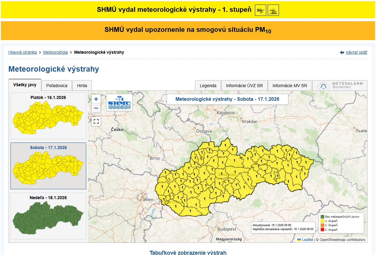 Slovenský hydrometeorologický ústav vydal výstrahy prvého stupňa pred hmlou a poľadovicou, ktoré platia pre celý Trenčiansky kraj až do nedele rána. Podľa meteorológov sa miestami očakáva dohľadnosť iba 50 až 200 metrov, čo predstavuje zvýšené riziko najmä pre vodičov, rovnako ako riziká spojené s poľadovicou na cestách, uvádza SHMÚ na stránke.