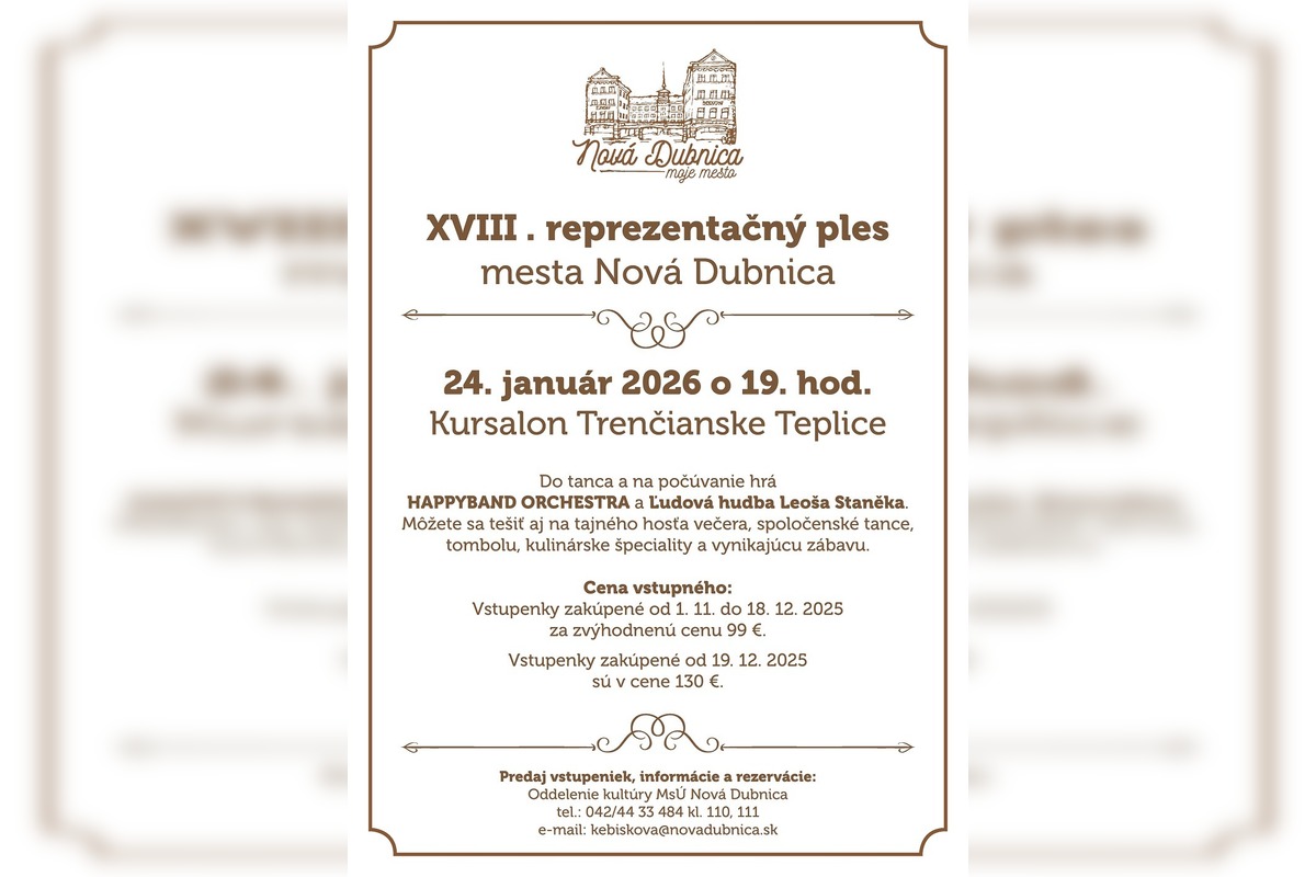 Už 24. januára 2026 o 19.00 hodine sa uskutoční XVIII. reprezentačný ples mesta Nová Dubnica. Dejiskom podujatia bude Kursalon v Trenčianskych Tepliciach. Do tanca a na počúvanie bude hrať Happyband Orchestra a ľudová hudba Leoša Staněka. Program doplnia spoločenské tance, tombola, kulinárske špeciality a tajný hosť večera.