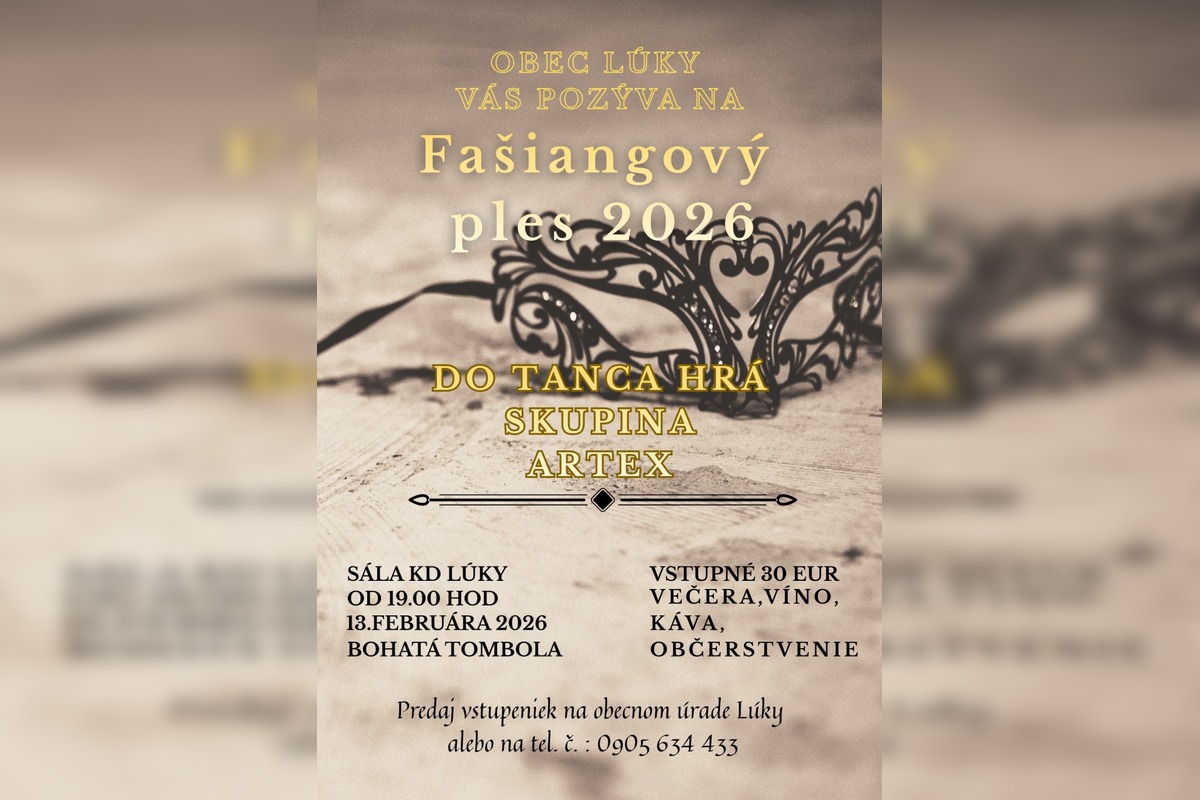 Fašiangovú atmosféru prinesie Fašiangový ples 2026, ktorý sa uskutoční 13. februára 2026 o 19.00 hodine v Kultúrnom dome Lúky. Podujatie organizuje Obec Lúky a do tanca bude hrať skupina Artex. Vstupné je 30 eur, vstupenky sú dostupné na Obecnom úrade v Lúkach alebo na telefónnom čísle 0905 634 433.