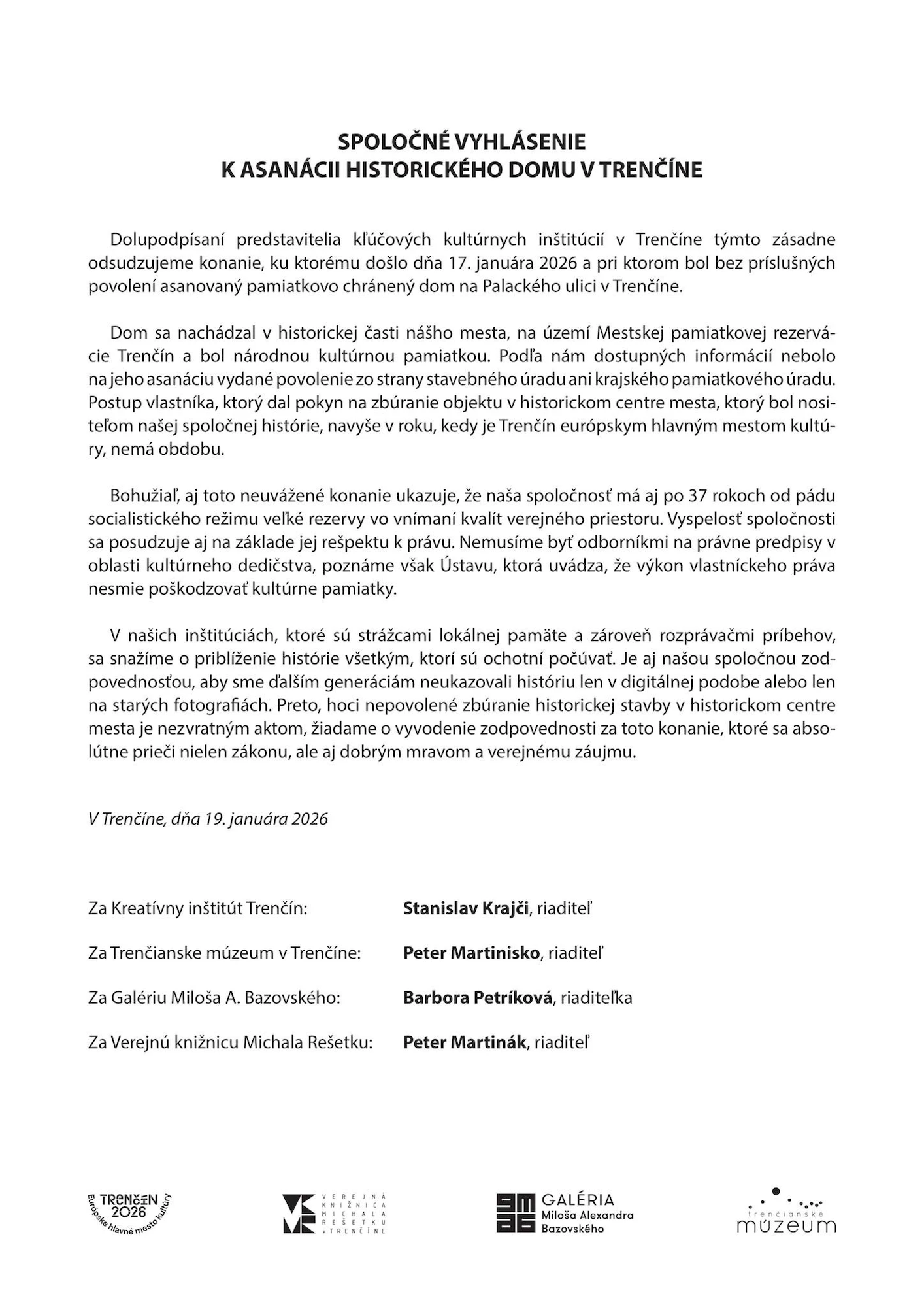 Dolupodpísaní predstavitelia kľúčových kultúrnych inštitúcií v Trenčíne dôrazne odsudzujeme konanie, ku ktorému došlo dňa 17. januára 2026, keď bol bez príslušných povolení asanovaný pamiatkovo chránený dom na Palackého ulici v Trenčíne. Predmetný objekt sa nachádzal v historickej časti mesta, na území Mestskej pamiatkovej rezervácie Trenčín, a bol vyhlásený za národnú kultúrnu pamiatku. Podľa informácií, ktoré máme k dispozícii, nebolo na jeho zbúranie vydané povolenie ani zo strany stavebného úradu, ani zo strany krajského pamiatkového úradu.