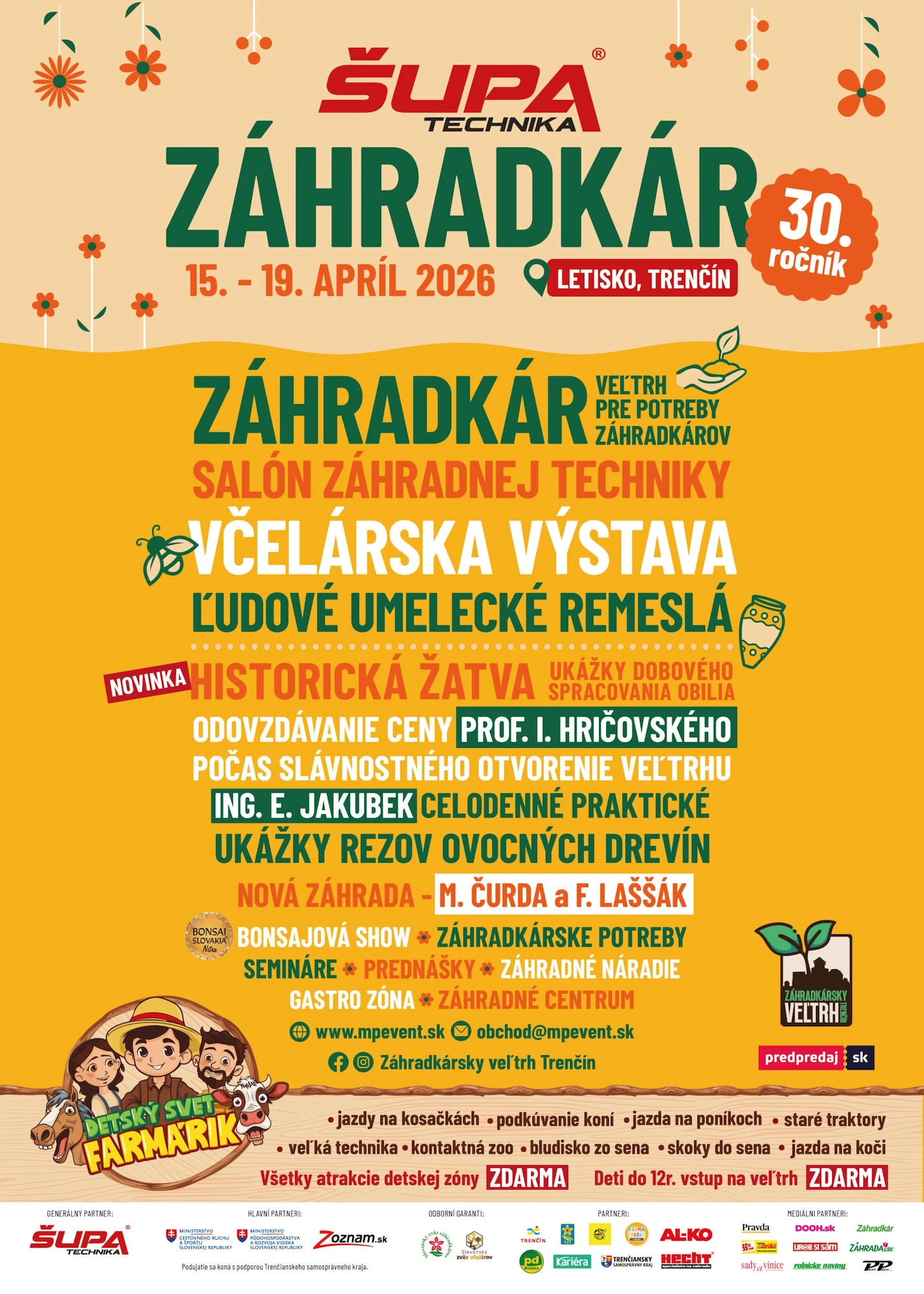Trenčín sa v apríli opäť stane centrom záhradkárov, včelárov aj milovníkov tradičných remesiel. Jubilejný 30. ročník veľtrhu Záhradkár 2026 sa uskutoční od 15. do 19. apríla 2026 v Trenčíne a organizátori sľubujú bohatý program pre všetky vekové kategórie.
