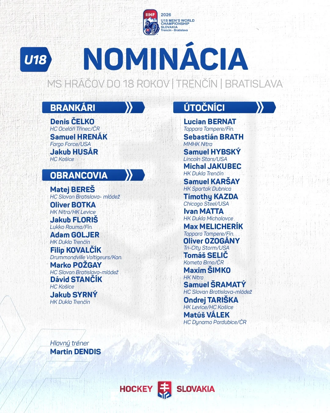 Slovensko sa po deviatich rokoch opäť stane dejiskom vrcholného mládežníckeho hokeja. Elitný šampionát hráčov do 18 rokov tentoraz privítajú Trenčín a Bratislava, slovenský výber odohrá svoje zápasy práve v Trenčíne pod vedením hlavného trénera Martina Dendisa. Domáci tím čaká hneď na úvod mimoriadne náročná skúška, už v stredu 22. apríla nastúpi proti obhajcom titulu z Kanady.