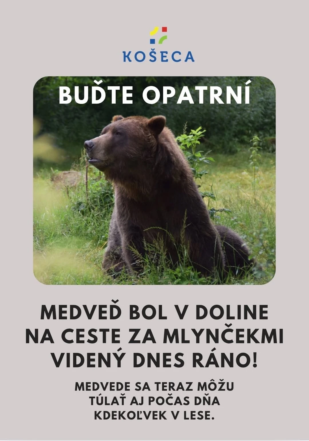 Obec Košeca (okres Ilava) upozorňuje obyvateľov na aktuálny výskyt medveďa v katastri obce. Podľa dostupných informácií bol medveď videný v utorok ráno v doline nad cestou za Mlynčekmi. „Buďte opatrní a pri návšteve lesa obozretní. Medvede majú v tejto dobe ruju a dospelí samci si hľadajú partnerky. Dávajte si pozor, ďakujeme za pochopenie," uviedla obec na sociálnej sieti.