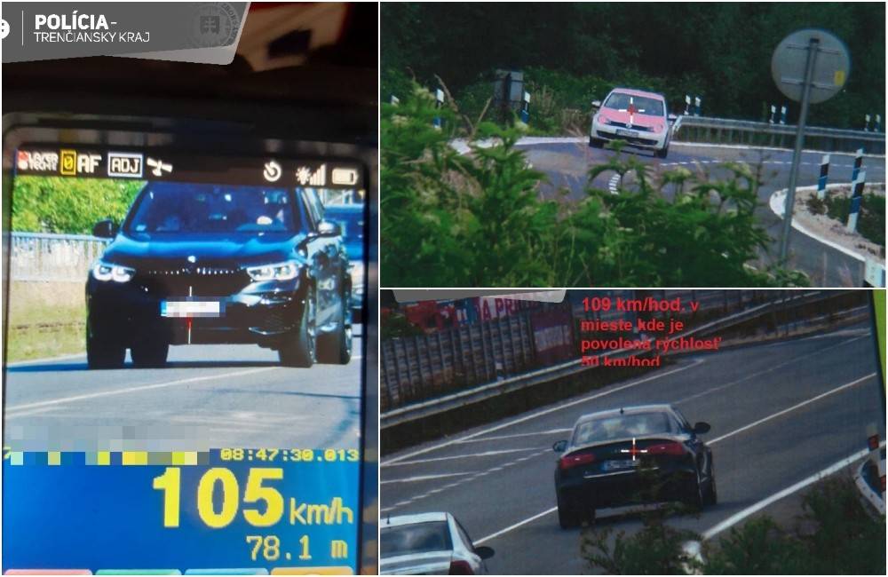 Príslušníci polície v Trenčíne zastavili 35-ročného vodiča Audi, ktorý v mieste, kde je povolená maximálna rýchlosť 50 kilometrov, jazdil rýchlosťou 109 kilometrov za hodinu, čím prekročil maximálnu povolenú rýchlosť o 59 kilometrov. Posledného vodiča namerali v Trenčianskej Teplej, kde jazdil na BMW rýchlosťou 105 kilometrov za hodinu, taktiež v úseku, kde platí povolených 50 kilometrov za hodinu.