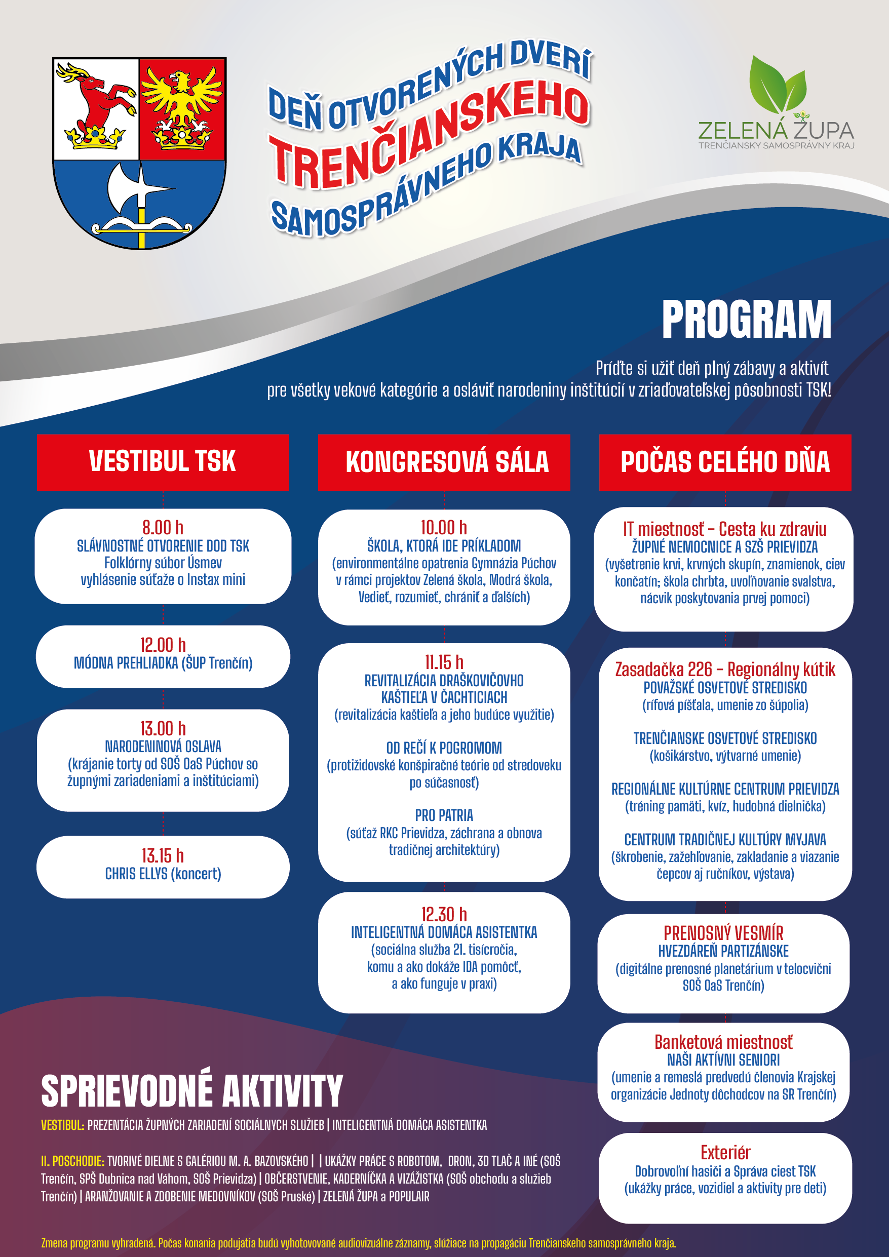 Návštevníkov čaká v poradí ôsmy Deň otvorených dverí TSK s bohatým programom, ktorý o 8:00 hod. otvorí Folklórny súbor Úsmev z Trenčína. Po ňom sa návštevníkom prihovorí hostiteľ dňa – predseda Trenčianskeho samosprávneho kraja Jaroslav Baška.