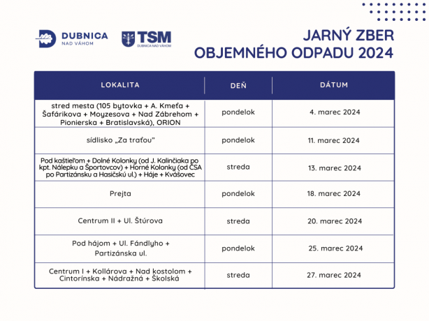 Gabriela Záhorcová z TSM Dubnica nad Váhom apelovala na obyvateľov mesta, aby dodržiavali harmonogram a objemný odpad vykladali k nádobám na komunálny odpad v predvečer dňa zberu v danej lokalite, najneskôr však do 7.00 hodiny v deň zberu.