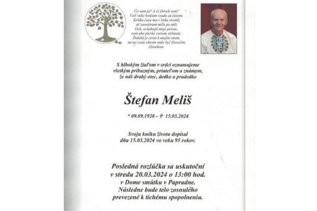 V piatok 15. marca vo veku 95. rokov tento svet opustil Štefan Meliš, ktorý bol výraznou osobnosťou kultúrneho života na Považí. Posledná rozlúčka sa uskutoční v stredu 20. marca o 13:00 hod. v Papradne.