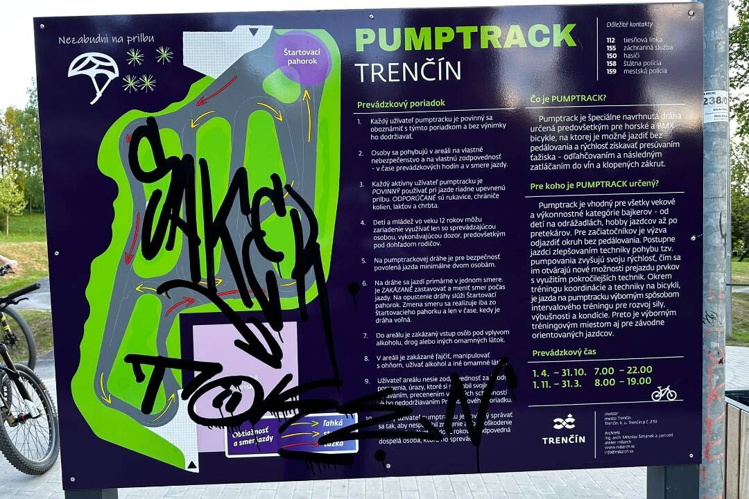 Mesto Trenčín má od soboty 6. apríla novú atrakciu. Práve vtedy sa konalo slávnostné otvorenie prvej pumptrackovej dráhy v parku pod Juhom. Včera 26. apríla však návštevníci dráhy upozornili na vandalizmus. Neznámy „umelec“ tam nechal po sebe posprejovanú informačnú tabuľu.
