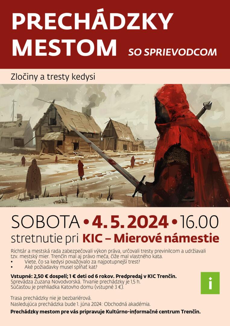 „Chceli by ste vedieť, aké požiadavky musel kedysi spĺňať kat? Čo bolo v minulosti považované za najpotupnejší trest? Určite sa nechajte pozvať na prechádzku mestom so sprievodkyňou Zuzanou Novodvorskou a dozviete sa nielen odpovede na tieto otázky, ale ešte oveľa viac,“ píše mesto na webe. Trenčín mal v minulosti aj právo meča, čiže mal vlastného kata.