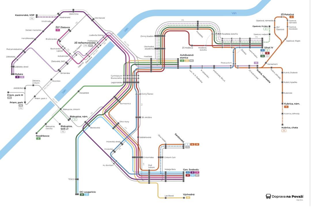 „Prestúpiť bude potrebné napríklad pri ceste z Východnej ulice na Sihoť alebo zo Zámostia do OC Laugaricio. Nové prestupné spojenia však budú premávať výrazne častejšie než dnešné priame linky, ktoré majú často len pár odchodov za deň,“ vysvetľuje projektant cestovných poriadkov Tomáš Mihalik z Dopravy na Považí. Z Opatovej do Kubrej, zo Sihote a Zámostia k OC MAX a Kauflandu v Merine naopak pribudnú nové priame spojenia.