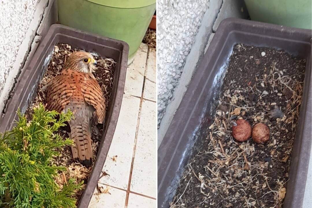FOTO: Na balkóne v Trenčianskych Tepliciach sa usídlil dravý vták. Samička sokola myšiara už zniesla tri vajíčka
