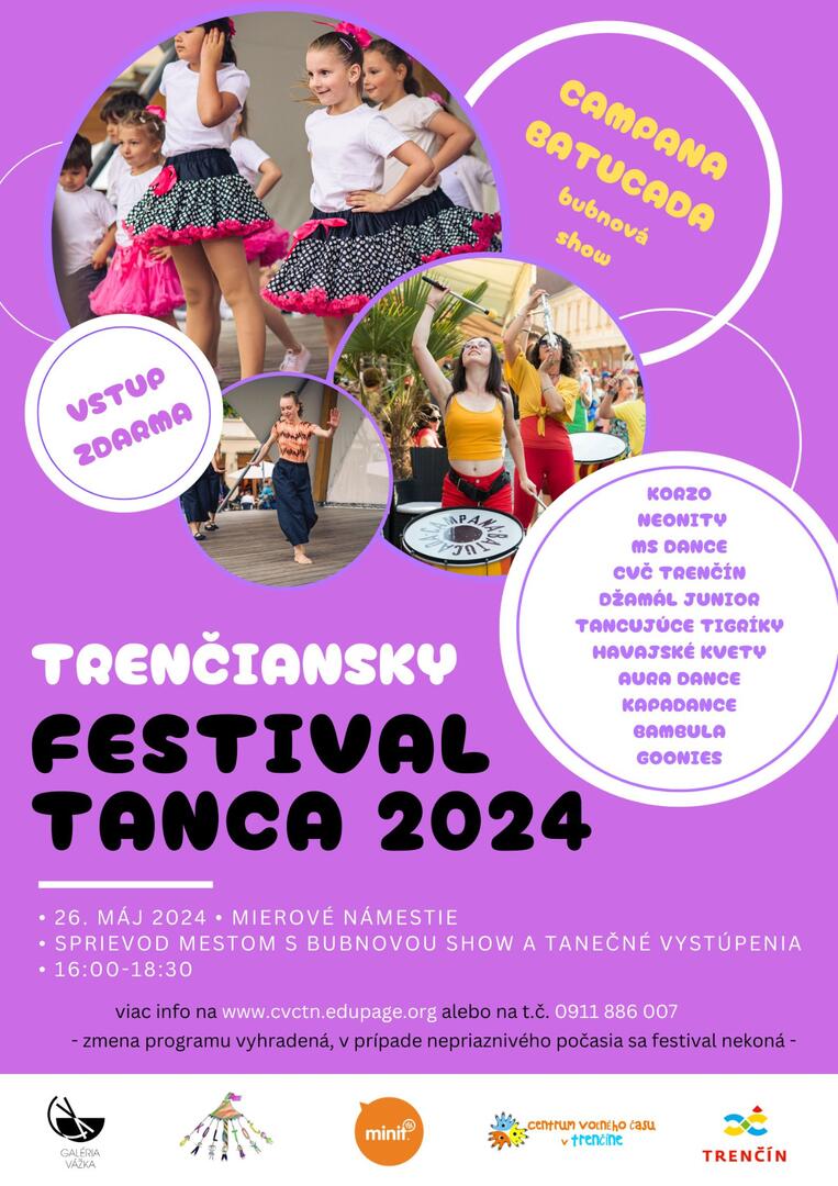 Trenčiansky festival tanca sa uskutoční v nedeľu 26. mája od 16:00 do 18:30 hod. na Mierovom námestí v Trenčíne. Je to festival, ktorý prezentuje a zároveň spája všetkých trenčianskych tanečníkov na jednom mieste. Naposledy sa takýto festival konal v roku 2022.