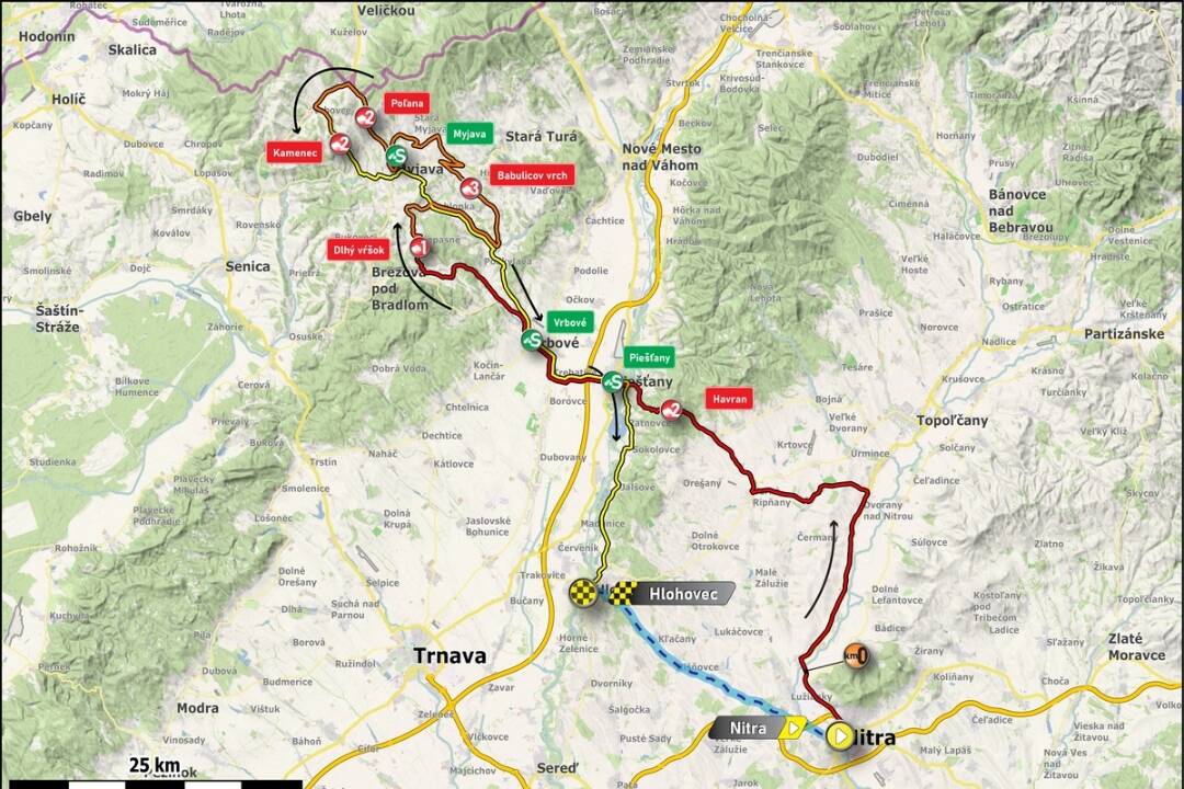 V okolí Myjavy, čiže oblasť Košariská, Dlhý vŕšok, Priepasné, Polianka, Jablonka, Rudník, Matejovec, Krajné, Poriadie, Stará Myjava, Brestovec, mestská časť Turá Lúka, Vrbovce sa bude 150 členný peletón so sprievodným konvojom pohybovať v čase asi od 13.54 do 15.50 hod. „Bezprostredne Myjavy, kde bude jedna z rýchlostných prémií, sa budú dotýkať prejazdy cez centrum mesta, po Námestí M. R. Štefánika, cez Staromyjavskú ulicu, ulicu Pirte, Ul. 1. mája, Novomestskú ulicu, mestskú časť Turá Lúka a po štátnej ceste II/499. Prejazd cez Myjavu je organizátormi plánovaný v čase od 14.50 do 15.05 hod,“ píše mesto na webe.