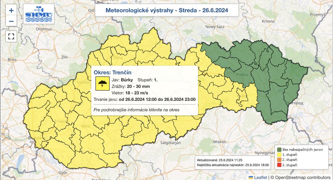 Slovenský hydrometeorologický ústav (SHMÚ) z tohto dôvodu vydal výstrahu prvého stupňa pred búrkami pre celý Trenčiansky kraj. Výstraha platí v stredu od 12:00 do 23:00 hod. Búrky by mal sprevádzať prudký lejak s intenzitou 20 - 30 milimetrov za 30 minút, s nárazmi vetra 65 - 85 kilometrov za hodinu a s krúpami, ktoré môžu poškodiť vegetáciu. Súvislá vrstva krúp na komunikácii môže prechodne obmedziť cestnú premávku.