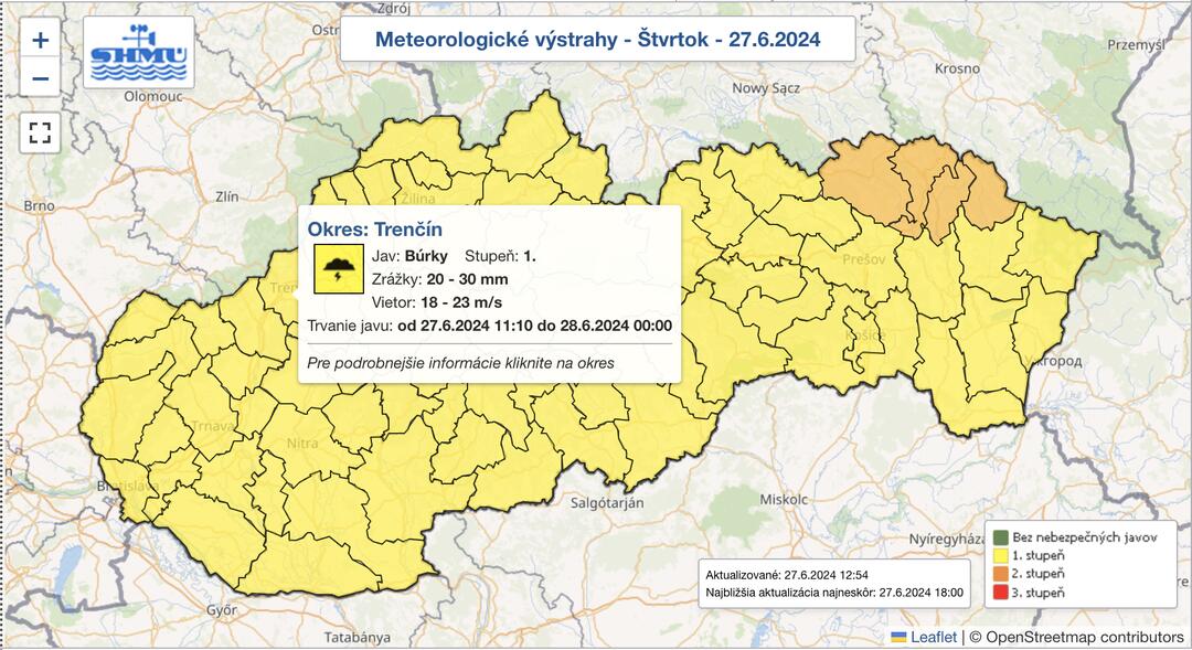 Slovenský hydrometeorologický ústav (SHMÚ) aj dnes vydal výstrahu prvého stupňa pred búrkami, ktorá platí počas celého dnešného dňa až do polnoci. Predpokladaný úhrn zrážok sa odhaduje na 20 až 30 milimetrov za 30 minút, búrky môže sprevádzať aj silný vietor s rýchlosťou 65 až 85 kilometrov za hodinu či krupobitie, ktoré môže poškodiť vegetáciu. Súvislá vrstva krúp na komunikácii môže prechodne obmedziť cestnú premávku.