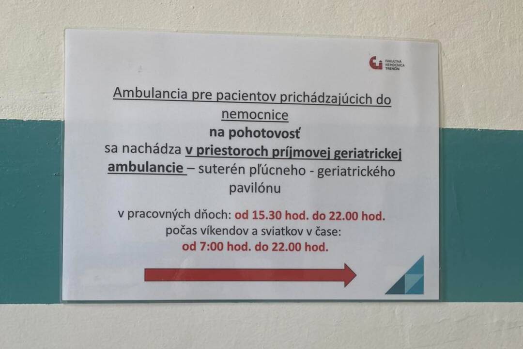 Fakultná nemocnica Trenčín sa snaží nahradiť ambulantnú pohotovostnú službu, no zároveň upozorňuje, že nie je plnohodnotnou náhradou. FNTN oznámila prostredníctvom svojej stránky na sociálnej sieti, že sa opäť mení miesto prijímania pacientov. „Ambulanciu pre pacientov prichádzajúcich do pohotovosti vo FN Trenčín sme dočasne zriadili v priestoroch geriatrickej príjmovej ambulancie (suterén pľúcneho pavilónu). Fungovať bude v pracovných dňoch od 16:00 hod. do 22:00 hod. cez víkend. od 7:00 hod. do 22:00 hod.“
