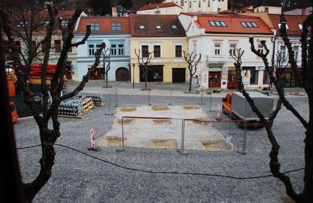 Zabetónované pätky boli pod dlažbou ukryté ešte v minulom roku. Dnes ich obnažili a od zajtra, utorka 13. marca, plánujú montáž ukotvenia nového pódia.