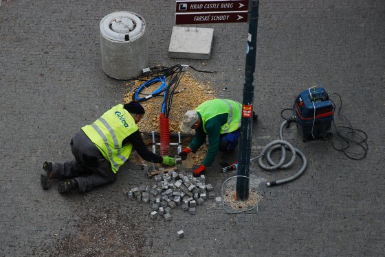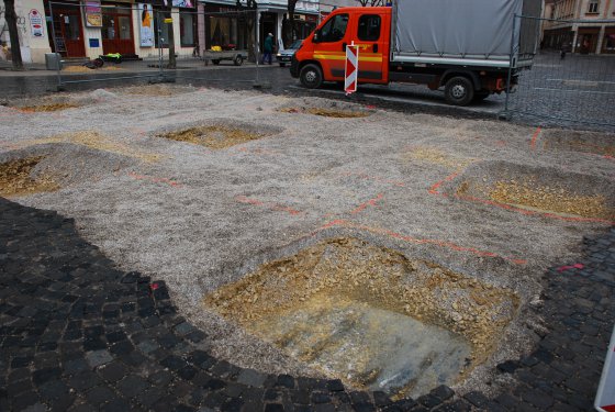Mesto Trenčín informovalo o postupe rekonštrukčných prác v centre. Na Mierovom námestí dnes odkryli časť dlažby a obnažili deväť pätiek, potrebných na ukotvenie pódia.