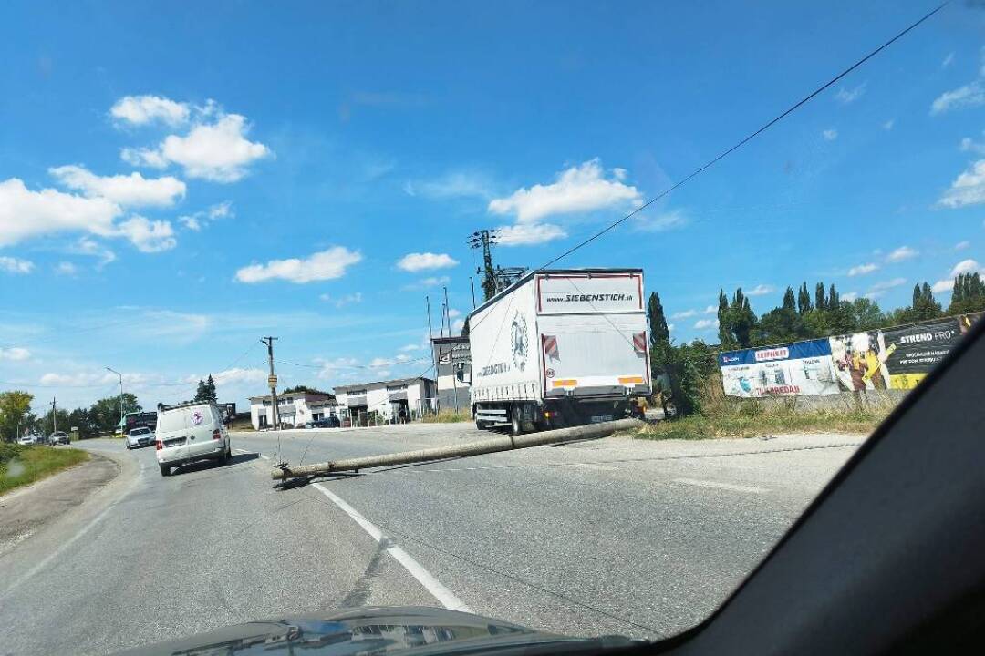 Vodiči pozor, na výjazde z Malých Uheriec do Partizánskeho nákladné auto narazilo do stĺpu vysokého napätia