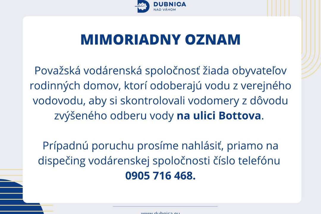 Na Bottovej ulici v Dubnici nad Váhom hlási Považská vodárenská spoločnosť zvýšený odber vody. Mesto žiada obyvateľov prostredníctvom oznamu na sociálnej sieti, aby si skontrolovali svoje vodomery a prípadnú poruchu alebo podozrenie na poruchu ihneď nahlásili.
