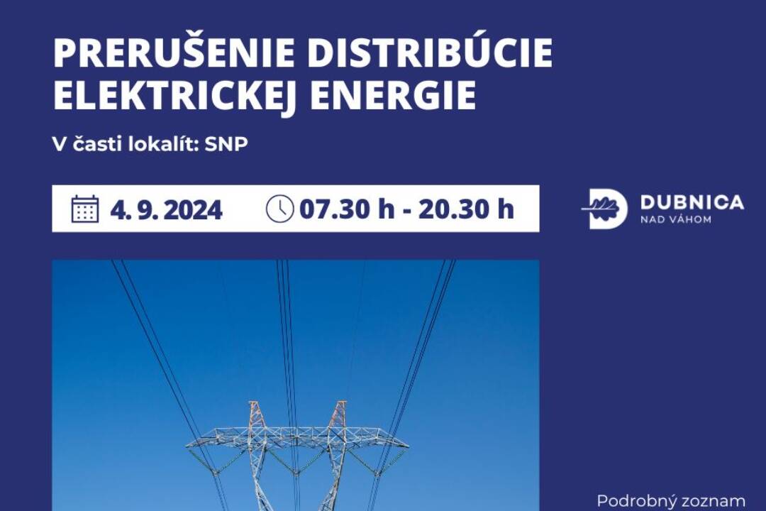 „Stredoslovenská distribučná spoločnosť informuje, že v stredu 4.9. bude v čase od 7.30 hod. do 20.30 hod. prerušená distribúcia el. energie v časti: SNP,“ píše mesto Dubnica nad Váhom svojím obyvateľom. Podrobný zoznam odberných miest nájdete na www.dubnica.eu alebo na sociálnych siatiach.
