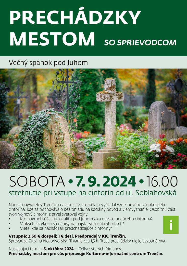Kultúrno-informačné centrum (KIC) v Trenčíne vás pozýva na ďalšiu Prechádzku mestom so sprievodcom, ktorá sa uskutoční v sobotu 7. septembra o 16:00 hod., tentokrát na tému Večný spánok pod Juhom. Stretnutie je dohodnuté pred vstupom na cintorín pod Juhom od Soblahovskej ulice.