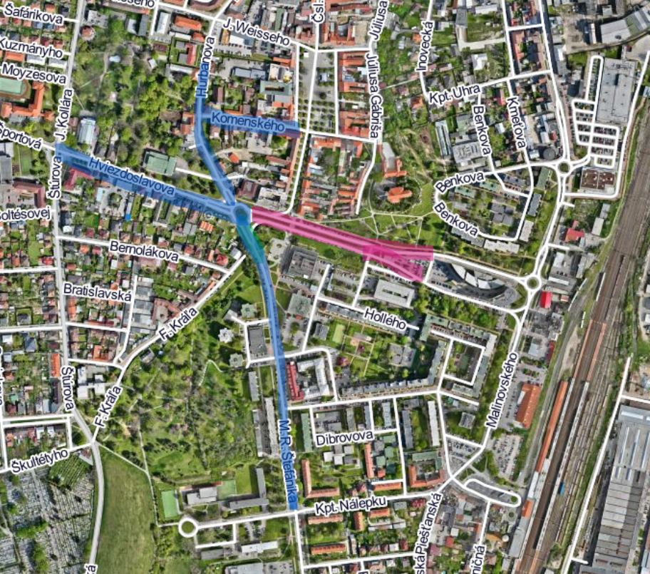 - ulica Hviezdoslavova v úseku od okružnej križovatky ulíc M. R. Štefánika a Hurbanova, po okružnú križovatku s cestou II/504 ulíc J. Kollára a Štúrova,