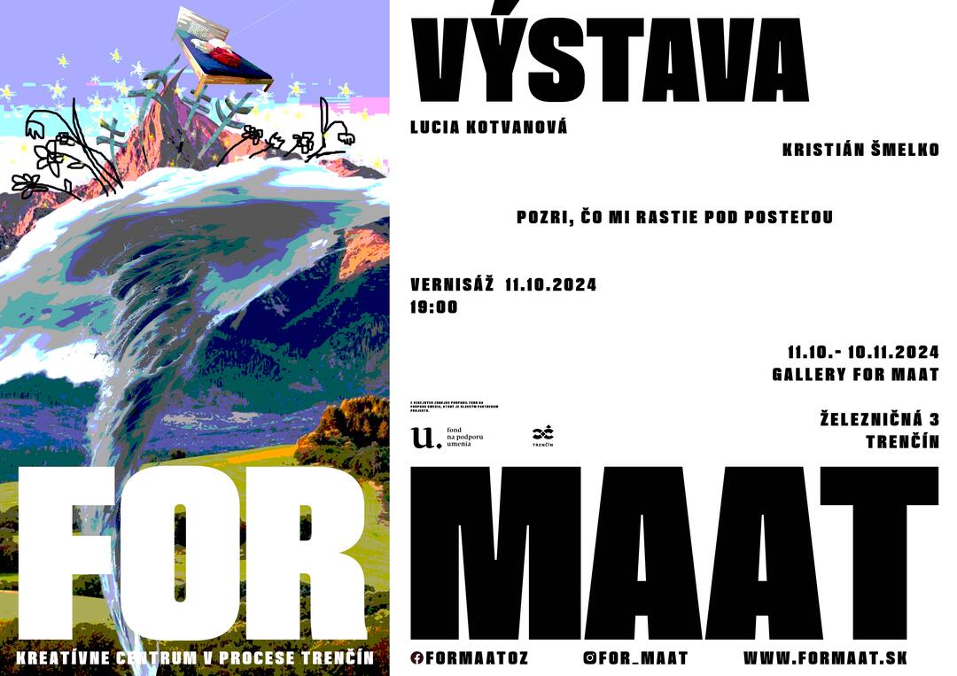 V piatok 11. októbra o 19:00 hod. sa v trenčianskej galérii FOR MAAT uskutoční vernisáž výstavy Lucie Kotvanovej a Kristiána Šmelka s názvom Pozri, čo mi rastie pod posteľou. Na vernisáž zavítajú aj hostia Anna Mihóková a Lucia Čarnecká.