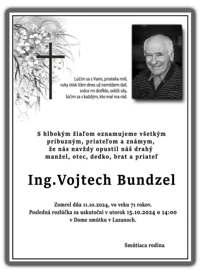 Pán Bundzel zomrel vo veku 71 rokov. Posledná rozlúčka, s týmto výnimočným človekom, bude v utorok 15. októbra v Dome smútku v Lazanoch, odkiaľ pochádzal. Prostredníctvom sociálnych sietí sa s ním lúčia kolegovia zo železiarstva, kde roky pracoval ako vedúci.