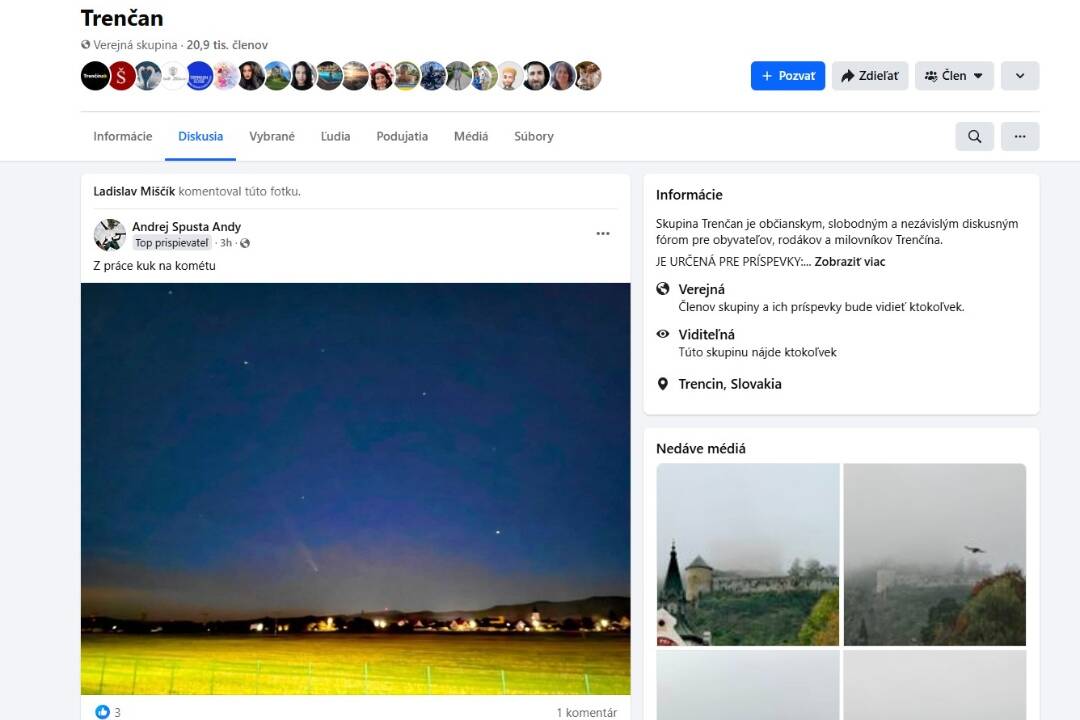 Dnes je však možné tento vesmírny objekt pozorovať aj voľným okom. Najlepšie je viditeľná do hodiny od zotmenia. Nočné divadlo láka amatérskych astrológov, ale aj rodiny s deťmi. „My sme boli včera pozorovať s manželom a synmi na Hrabovke, je odtiaľ skvelý výhľad a bolo jasno. Kométu sa nám podarilo nádherne zachytiť na mobily," napísala Mirka, ktorá sa podelila o vydarený záver v skupine Trenčan.