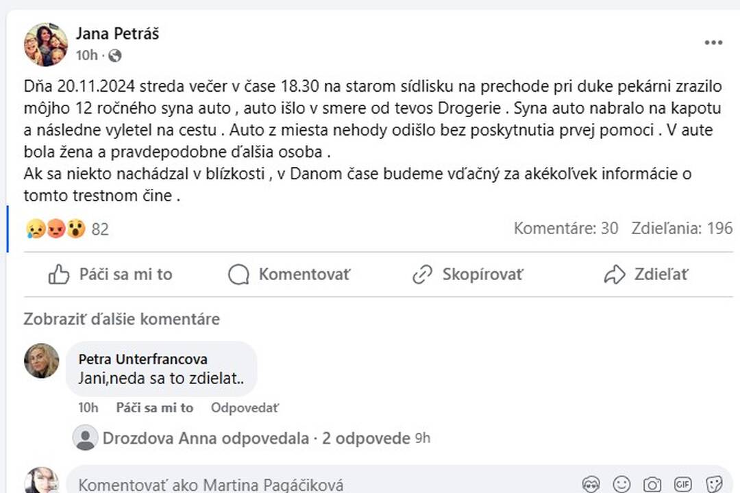 Pani Jana zažila poriadny šok, keď jej dieťa zrazilo v meste auto. Ešte väčšie pohoršenie vzbudzuje, že dieťaťu vodič neposkytol prvú pomoc a z miesta nehody odišiel. „Dňa 20.11.2024 streda večer v čase 18.30 na starom sídlisku na prechode pri duke pekárni zrazilo môjho 12 ročného syna auto, auto, išlo v smere od tevos Drogerie,“ napísala status nahnevaná matka.