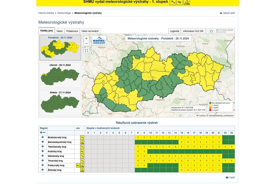 „Ojedinele sa očakáva výskyt vetra, ktorý dosiahne krátkodobo, v nárazoch, rýchlosť 18 - 20 m/s (65 - 70 km/h) a priemernú rýchlosť okolo 12 m/s (45 km/h),“ upozorňuje na svojej stránke SHMU. Výstraha platí od skorých ranných hodín až do neskorej noci, do 02:00. Vietor o tejto sile môže spôsobiť škody menšieho rozsahu, no v tomto ročnom období je bežný.