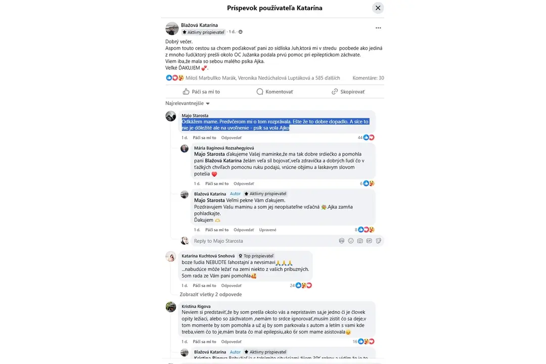 „Bože ľudia NEBUDTE ľahostajní a nevšímaví...nabudúce môže ležať na zemi niekto z vašich príbuzných. Som rada, že Vám pani pomohla," ocenila neznámu hrdinku Katka a aj ostatní v skupine. „Vďaka bohu za tu pani, čo vám pomohla. A ľudia sa čudujú, prečo sa bojím o dcéru keď niekde chodí sama (tiež ma epilepsiu). Presne z tohto mam strach, že by ju ľudia obišli a nechali tak bez pomoci,“ napísala svoju skúsenosť Kristína.