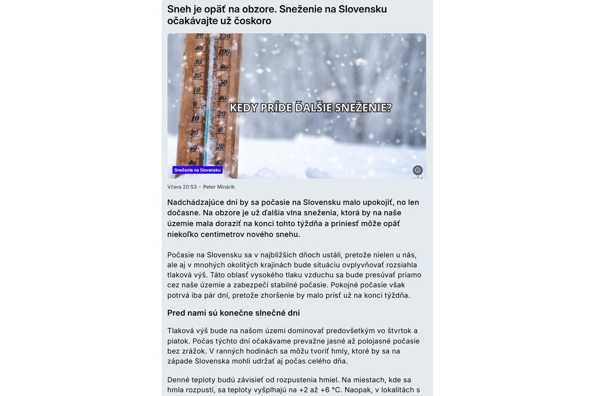Víkend bude mrazivý a to najmä v noci z piatka na sobotu. „V údoliach môže teplota klesnúť až na -13 °C.“ V sobotu očakávajte oblačno a miestami malé prehánky, no v nedeľu bude snežiť alebo pršať výdatnejšie. „Bude oblačno až zamračené a na mnohých miestach sneženie. V nižších polohách dážď so snehom alebo dážď,“ uzatvára Imeteo.