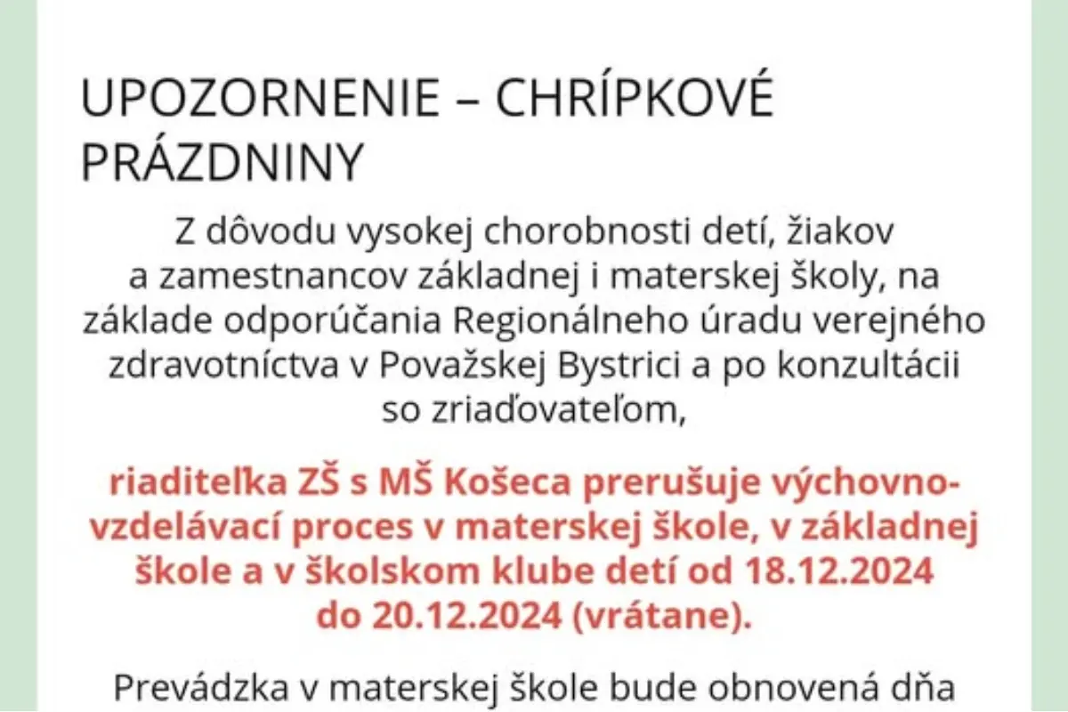 Podľa informácií televízie z Úradu verejného zdravotníctva najviac školských zariadení museli zavrieť práve v Trenčianskom kraji. Medzi obce, kde začali predčasne nechcené prázdniny je aj Košeca pri Ilave, ktorá o prerušení prechádzky informovala na svojom profile na sociálnej sieti.