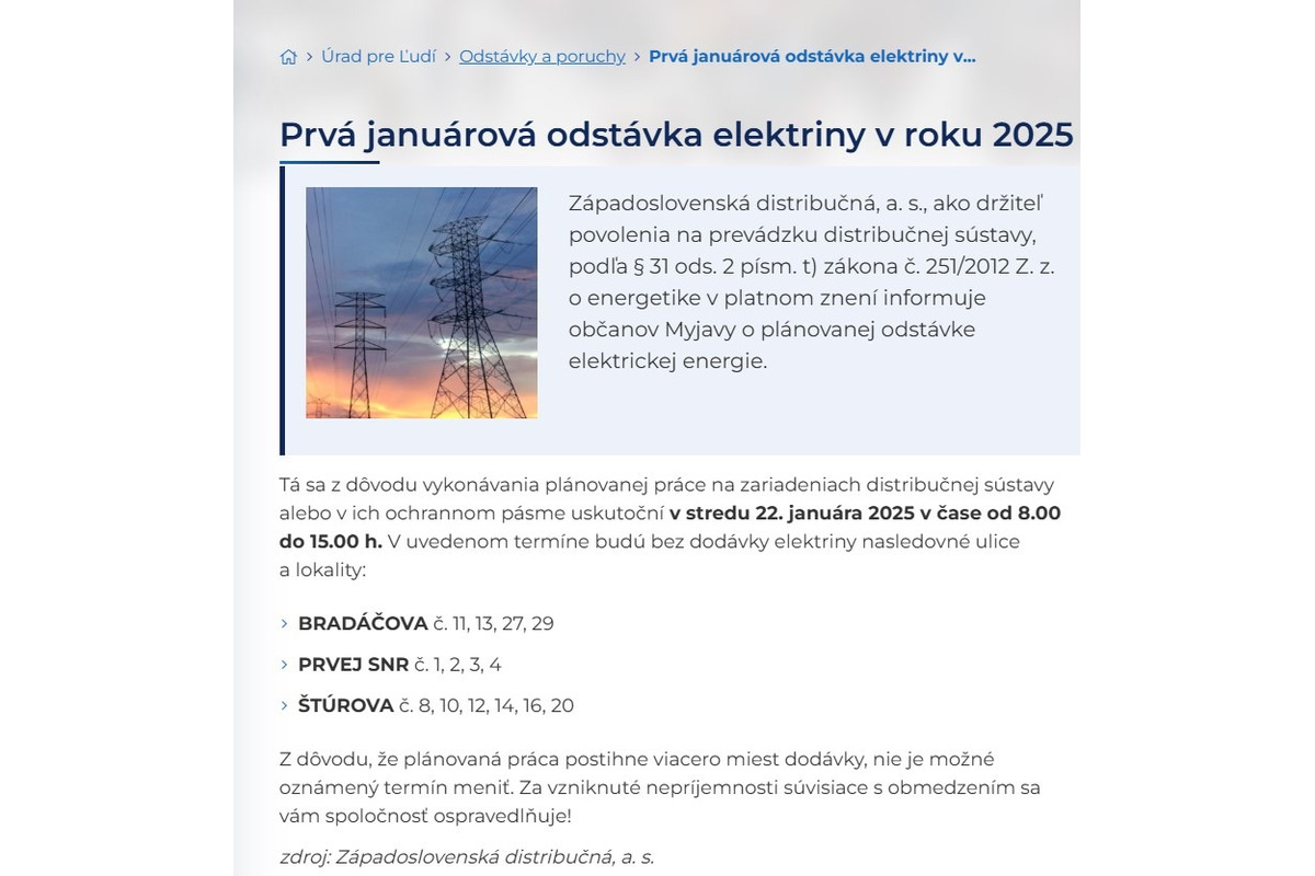 V uvedených termínoch budú bez dodávky elektriny nasledovné ulice a lokality: ulica BRADÁČOVA číslo domu 11, 13, 27, 29. Ulica PRVEJ SNR číslo domu 1, 2, 3, 4. Ulica ŠTÚROVA číslo domu 8, 10, 12, 14, 16, 20 a ulica JÁNOŠÍKOVA číslo domu 1, 3, 5, 7, 12, 14, 16. Z dôvodu, že plánovaná práca postihne viacero miest dodávky, nie je možné oznámený termín meniť. „Za vzniknuté nepríjemnosti súvisiace s obmedzením sa vám spoločnosť ospravedlňuje!“