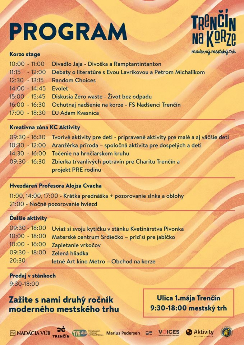 Trenčín na Korze si môžete po minuloročnom úspešnom štarte vychutnať opäť, a to už v sobotu 26. mája. Od rána bude pre vás pripravené množstvo stánkov s výrobkami šikovných ľudí, predovšetkým z okolia Trenčína. Neváhajte a prí´dte aj vz vytvoriť príjemnú atmosféru na modernom mestskom trhu.
