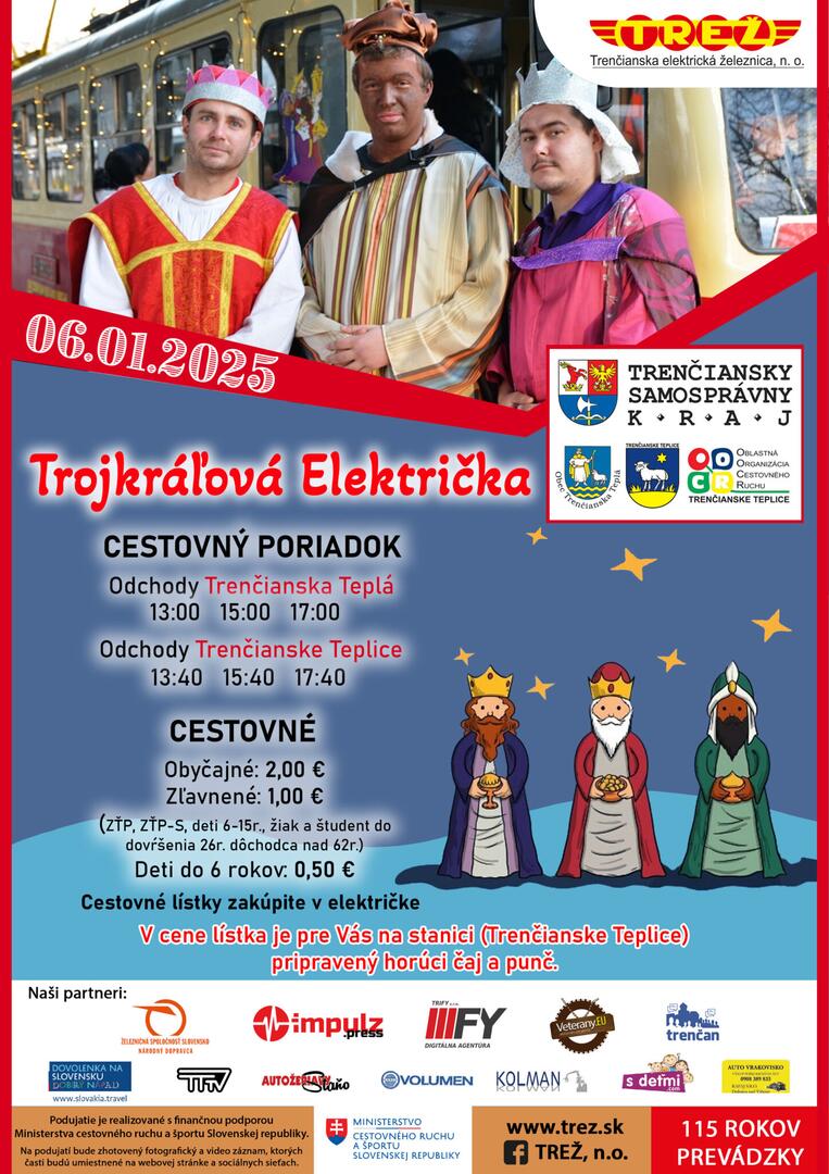Nezisková organizácia, ktorá zabezpečuje udržiavanie a prevádzkovanie elektrickej železnice medzi Trenčianskou Teplou a Trenčianskymi Teplicami vás pozýva v sviatočný pondelok 6. januára na Trojkráľovú električku. Zároveň upozorňuje cestujúcich, že v novom roku museli zvýšiť cestovné.