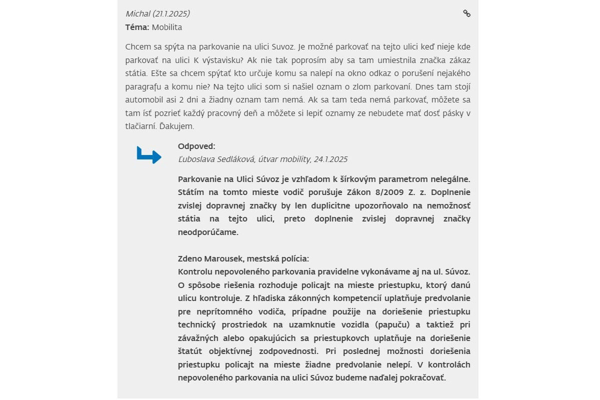Mesto však situáciu vysvetľuje a pripomína aj to, že na danom úseku je riadne značenie. „Parkovanie na Ulici Súvoz je vzhľadom k šírkovým parametrom nelegálne. Státím na tomto mieste vodič porušuje Zákon 8/2009 Z. z. Doplnenie zvislej dopravnej značky by len duplicitne upozorňovalo na nemožnosť státia na tejto ulici,“ vysvetľuje Ľuboslava Sedláková, z útvaru mobility.