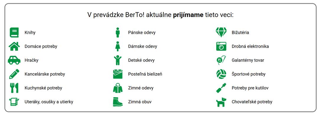 Podmienkou príjmu vecí je ich čistota, funkčnosť, zachovalý stav a možnosť ich ďalšieho možného využitia či už na ich pôvodný účel alebo na kreatívnu tvorbu, súčiastky, poprípade niečo úplne iné. Nadrozmerné predmety sa neprijímajú. Otvorené bude v utorky a stredy od 14:30 do 16:00 hod. a piatky od 9:00 do 11:00 hod.
