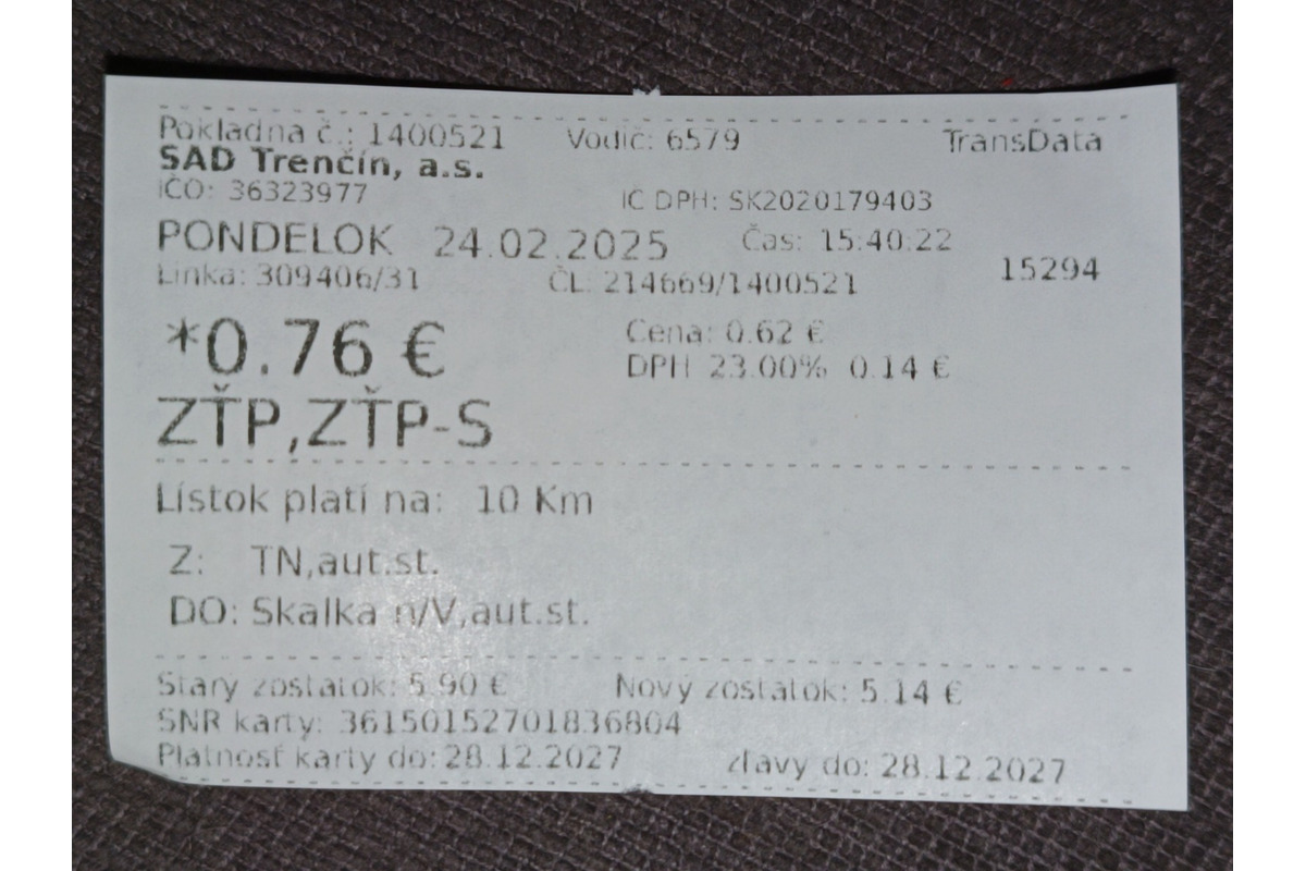 Cestujúci využil služby SAD Trenčín v pondelok 24. februára popoludní, keď cestoval z Autobusovej stanice v Trenčíne do Skalky nad Váhom. Cesta mu trvala približne 11 minút, počas ktorej prešiel viac ako 9 kilometrov. Za túto jazdu zaplatil 0,76 eur.