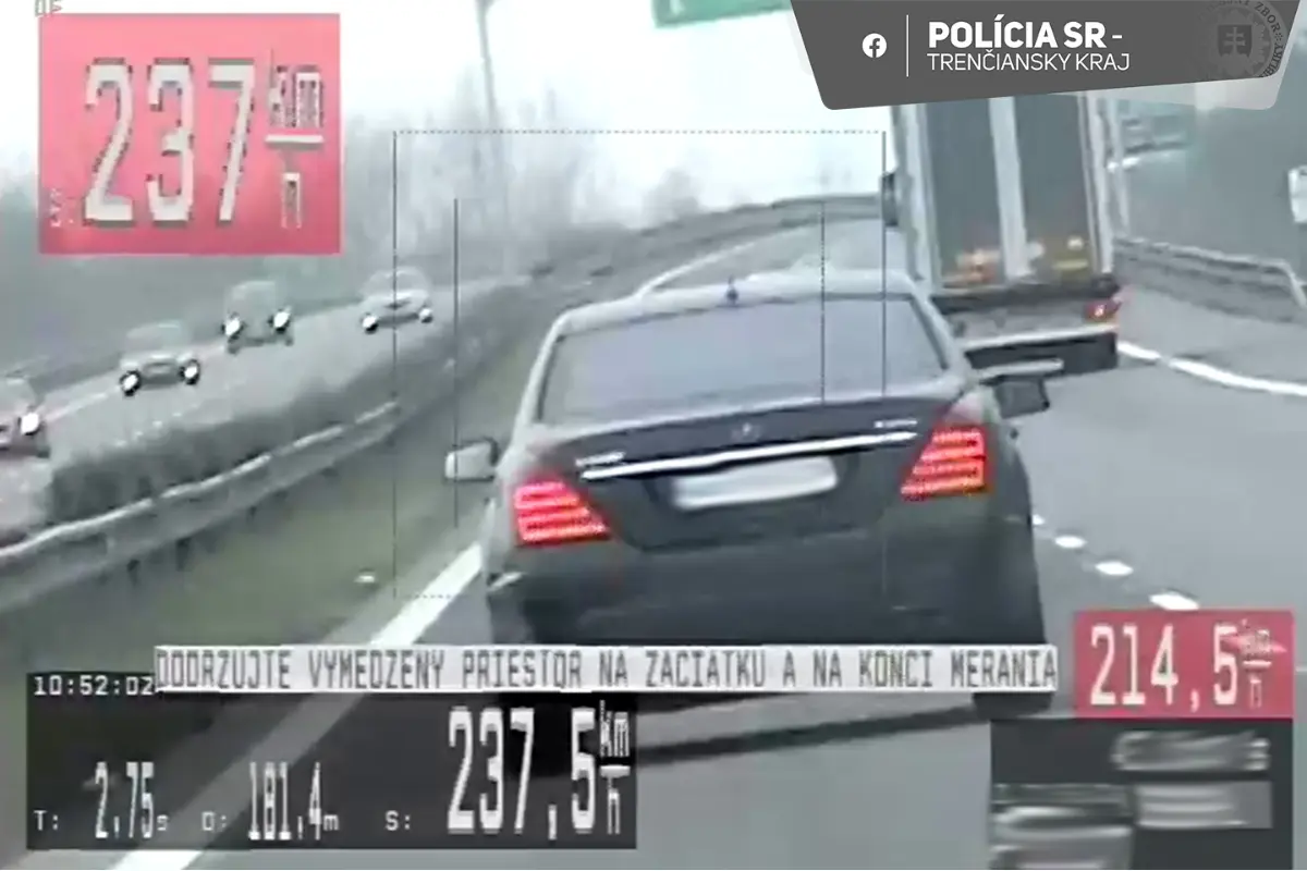 „Diaľniční policajti z Trenčína si v sobotu doobeda v spätnom zrkadle všimli rýchlo idúce vozidlo zn. Mercedes, ktoré predbiehalo veľkou rýchlosťou iné vozidlá, aj napriek zlému počasiu,“ informuje polícia na sociálnej sieti. Vodič bol zachytený na 130. kilometri diaľnice D1, v smere na Žilinu, v katastrálnom území Skalky nad Váhom pri Trenčíne.