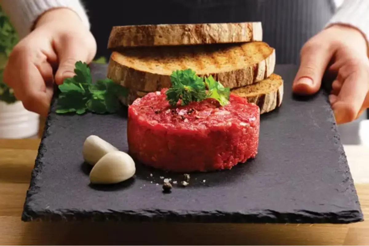 Postup prípravy: Mäso umyjeme, osušíme a poriadne ostrým nožom ho naškriabeme do misky. Ak sa nám nedarí mäso naškriabať, môžeme ho najemno pomlieť. Mokrými rukami vyformujeme z mäsa 4 bochníky, ktoré rozložíme na taniere. Urobíme do nich jamku, kde opatrne uložíme žĺtok. Cibuľu najemno nakrájame, pridáme ju k mäsu spolu s horčicou, kečupom a worčestrovou omáčkou. Každý si sám podľa vlastnej chuti pripraví tatarák na tanieri. Na záver opražíme chlieb a potrieme cesnakom.
