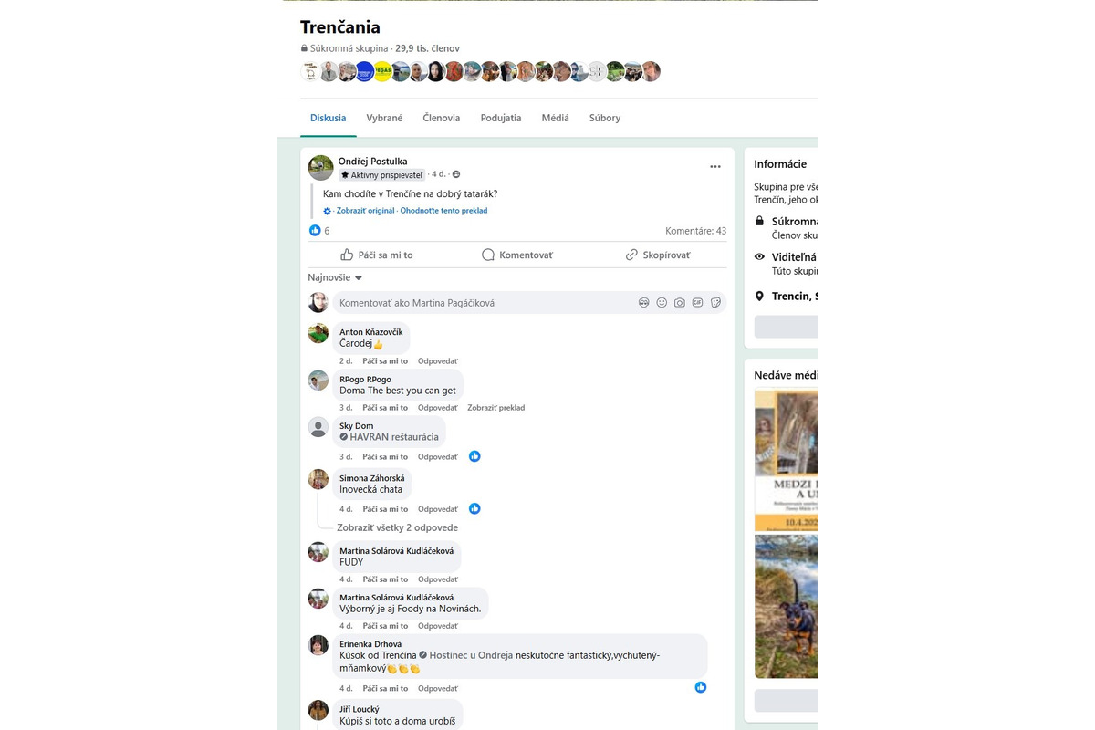 Trenčania, kde podľa vás robia najlepší tatarák v meste? Takúto informáciu zháňal Ondřej, ktorý sa pokúsil zistiť dobré tipy na sociálnej sieti. Obyvatelia Trenčína zrejme radi hodujú na tejto špecialite, pretože za pár minút dostal v skupine Trenčania hneď niekoľko tipov.